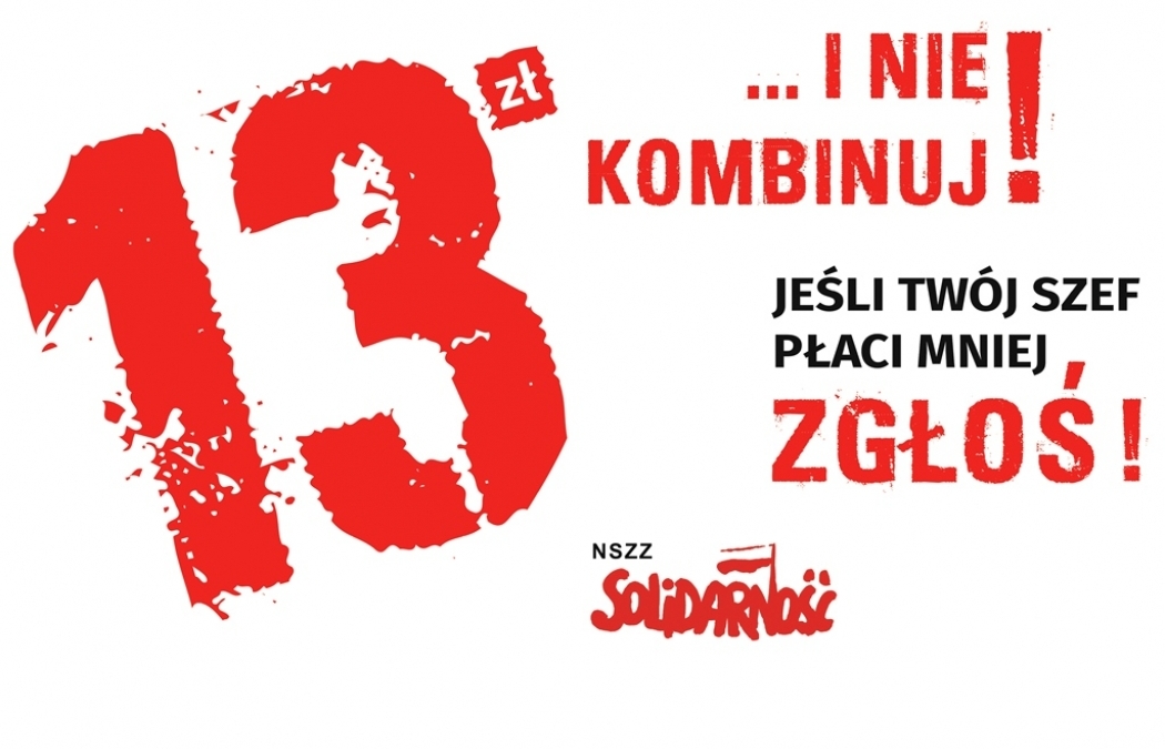 Kampania Solidarności i PIP "13 zł... i nie kombinuj!" zachęca pracowników nieotrzymujących minimalnego wynagrodzenia na umowie zleceniu do zażądania kontroli w firmie. Celem akcji jest wyegzekwowanie stosowania minimalnej stawki godzinowej przez wszystkich pracodawców. Link do akcji TUTAJ.