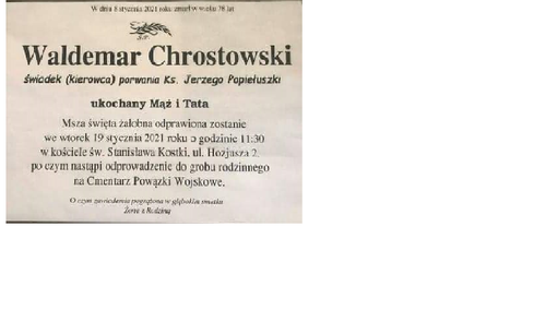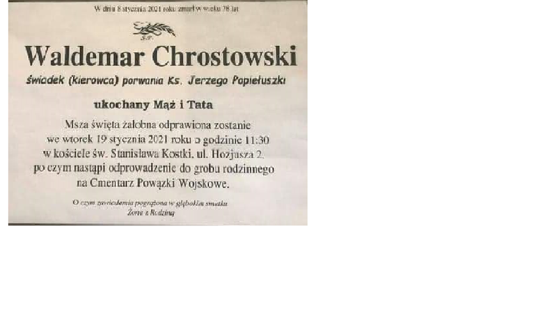Waldemar Chrostowski był kierowcą śp. ks. Jerzego Popiełuszki. Zmarł 8 stycznia. Jego pogrzeb odbędzie się jutro - 19 stycznia.