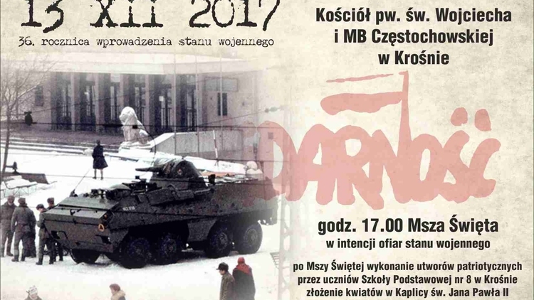 O godzinie 17 odbędzie się Msza Święta w intencji ofiar stanu wojennego. Po Mszy nastąpi wykonanie utworów patriotycznych przez uczniów Szkoły Podstawowej nr 8 w Krośnie i złożenie kwiatów w Kaplicy św. Jana Pawła II i bł. ks. Jerzego Popiełuszki.