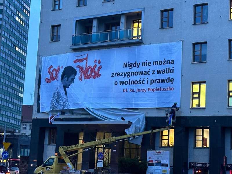 Na budynku Komisji Krajowej NSZZ „Solidarność” zawisł baner z bł. ks. Jerzym Popiełuszką