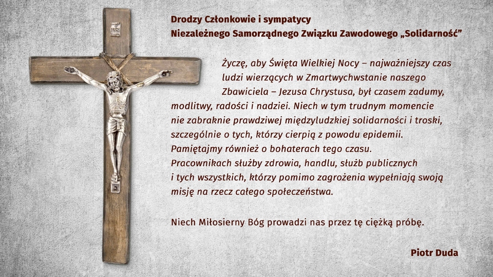 Drodzy Członkowie i sympatycy Niezależnego Samorządnego Związku Zawodowego „Solidarność”, życzę aby Święta Wielkiej Nocy – najważniejszy czas ludzi wierzących w Zmartwychwstanie naszego Zbawiciela – Jezusa Chrystusa, był czasem zadumy, modlitwy, radości i nadziei.