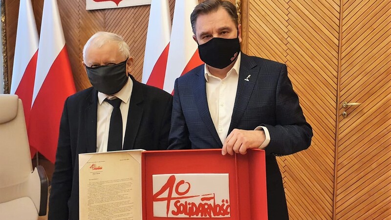 - Z powodu pandemii nie było wcześniej okazji do wręczenia pamiątkowej flagi z logo 40-lecia powstania NSZZ "Solidarność" - powiedział Piotr Duda przekazując flagę.