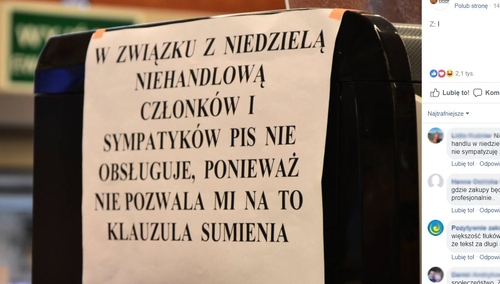 "W związku z niedzielą niehandlową sympatyków PiS nie obsługuję". Skandaliczna akcja w sklepie w Ostrowie