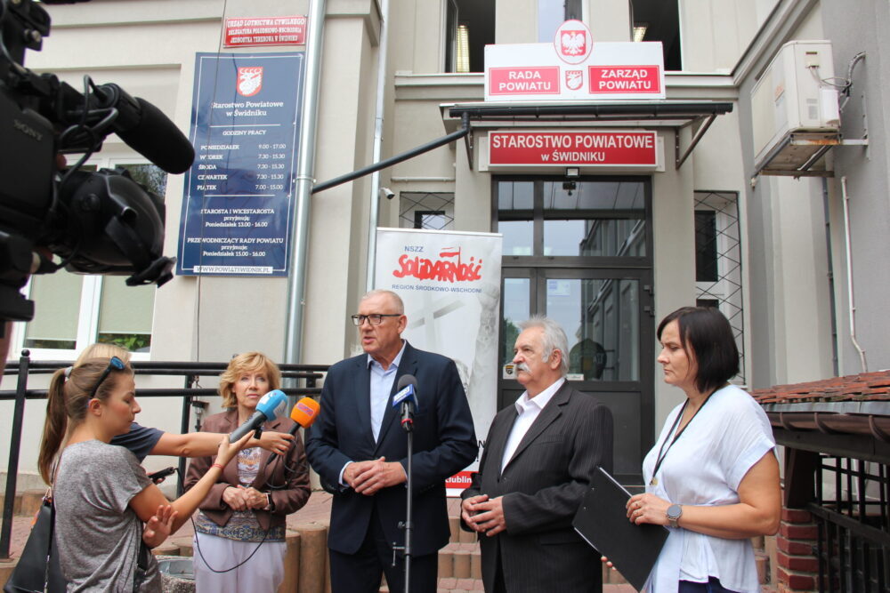 Przed siedzibą Starostwa Powiatowego w Świdniku, które nadzoruje szpital powiatowy w tym mieście, odbyła się 3 września konferencja prasowa z udziałem przedstawicieli Regionu Środkowo-Wschodniego NSZZ ''Solidarność''. Przewodniczącemu Markowi Wątorskiemu towarzyszyła jego zastępczyni Wiesława Stec, przewodniczący Zespołu ds. Zdrowia i Polityki Społecznej WRDS, Marek Chmielewski oraz przewodnicząca Organizacji Zakładowej NSZZ ''S'' w szpitalu Agata Nawrocka.