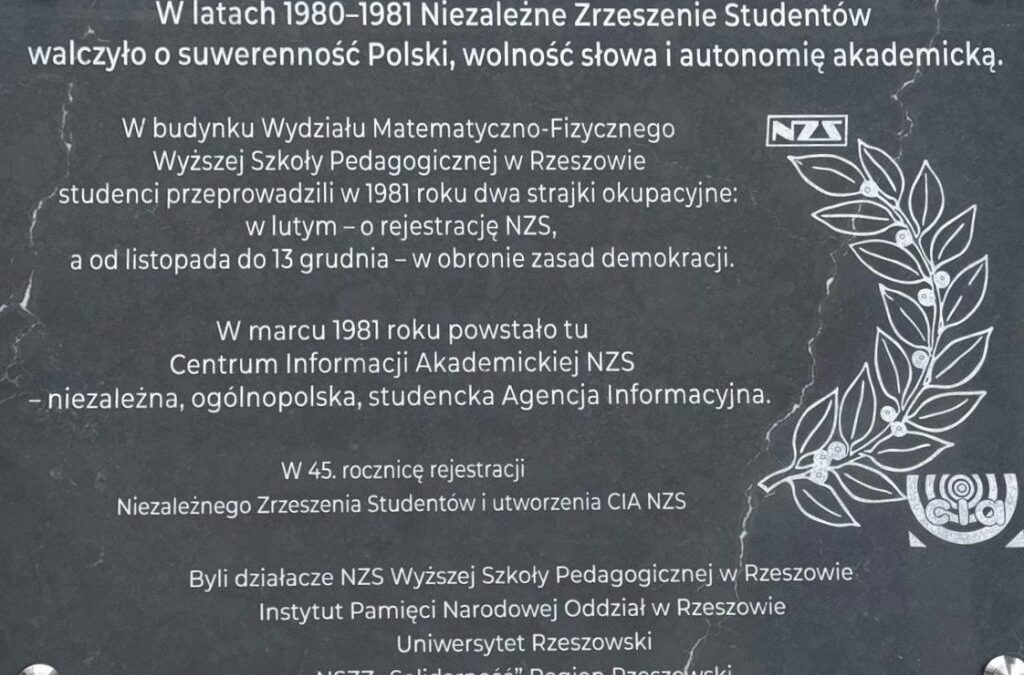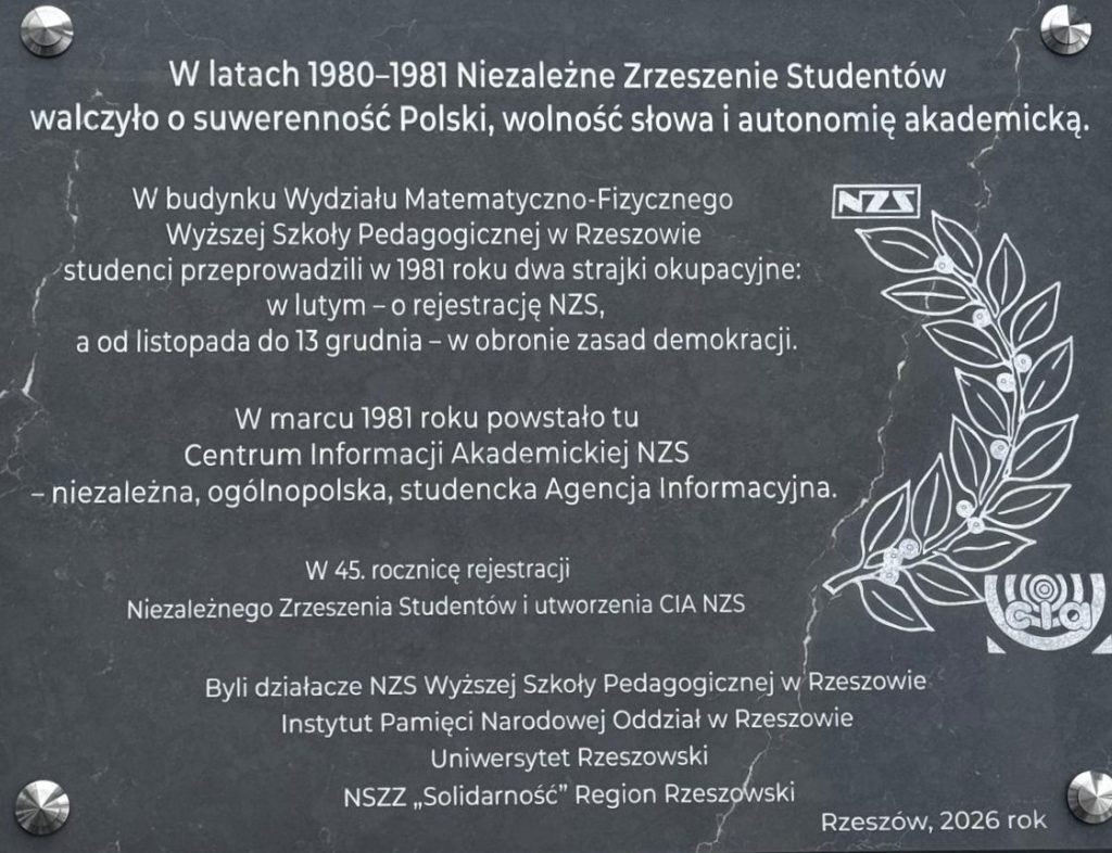 18 lutego 2026 r. odsłonięto tablicę upamiętniającą strajki okupacyjne zorganizowane w 1981 r. na Wydziale Matematyczno-Fizycznym Wyższej Szkoły Pedagogicznej w Rzeszowie przez działaczy Niezależnego Zrzeszenia Studentów.