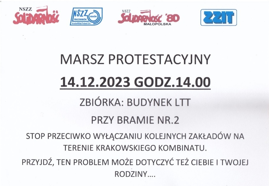 "Jeśli nie chcesz, by podobny scenariusz dotknął w przyszłości Twojego zakładu - weź udział w proteście! Przypomnij sobie, jakie obietnice składano w odniesieniu do pracy wielkiego pieca w Krakowie. Nie dajmy się zniszczyć! Walczmy o nasze prawa, godność i przyszłość! Niech nikogo nie zabraknie. Razem jesteśmy silniejsi!" - apelują organizatorzy.
