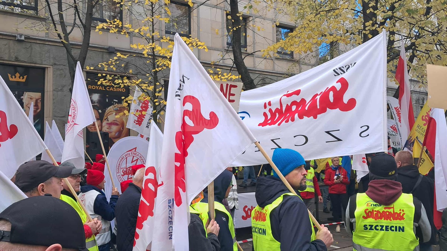 Pracownicy GK Enea protestują przed budynkiem Ministerstwa Aktywów Państwowych w Warszawie. Pikieta organizowana przez Międzyzakładową Organizację Związkową NSZZ "Solidarność" w Enea rozpoczęła się o godzinie 11:00. Bierze w niej udział Piotr Duda, przewodniczący Komisji Krajowej NSZZ "Solidarność".