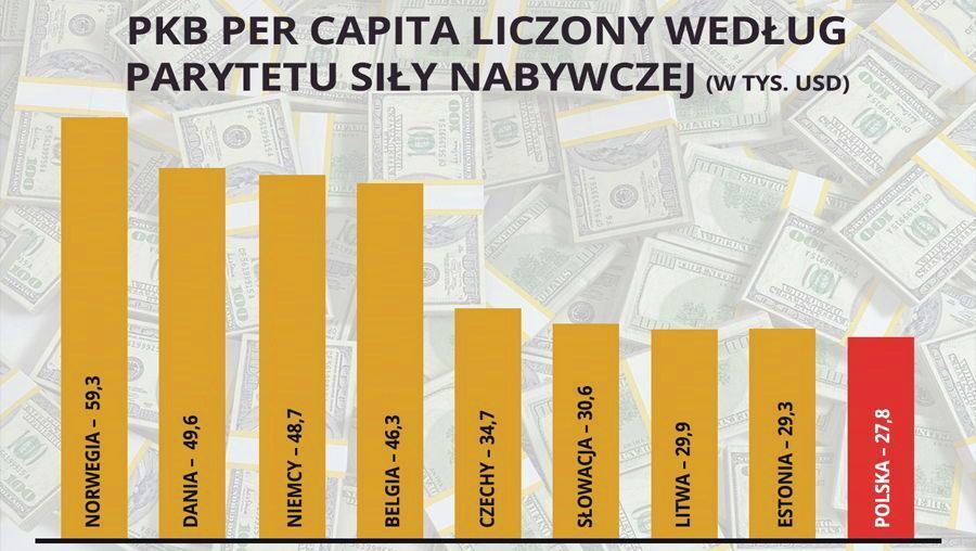 Porównując PKB per capita według siły nabywczej bierze się pod uwagę ceny określonych towarów i usług w poszczególnych państwach w tym samym czasie. Z danych Banku Światowego za 2016 rok wynika, że PKB per capita według parytetu siły nabywczej wynosi w naszym kraju 27,8 tys. dolarów. Dla porównania w Norwegii jest to 59,3 tys. dolarów, w Danii przeszło 49 tys. dolarów., a w Niemczech blisko 49 tys dolarów. Pod tym względem wyprzedzają Polskę nie tylko najbogatsze państwa, ale także Estonia (29,3 tys. dolarów), Litwa (29,9 tys. dolarów), Słowacja (30,6 tys. dolarów) oraz Czechy (34,7 tys. dolarów).