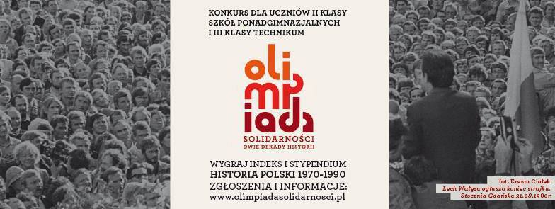 Trwa rejestracja szkół do IV edycji ogólnopolskiego konkursu historycznego – Olimpiada Solidarności. Dwie dekady historii (1970 – 1990). Dla laureatów I miejsca przewidziane są indeksy na Uniwersytet Warszawski, Uniwersytet Gdański oraz Uniwersytet Jagielloński, natomiast laureaci wszystkich trzech miejsc w nagrodę otrzymają roczne stypendium naukowe oraz bony, ważne przez 3 lata, na wybrane przez siebie publikacje IPN (książki, płyty DVD, gry planszowe).