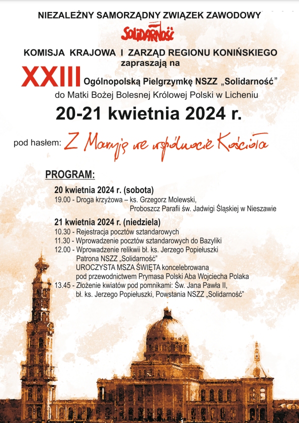 Już za nieco ponad dwa miesiące, w dniach 20-21 kwietnia, odbędzie się XXIII Ogólnopolska Pielgrzymka NSZZ "Solidarność" do Matki Bożej Bolesnej Królowej Polski w Licheniu, na którą zapraszają Komisja Krajowa oraz Zarząd Regionu Konińskiego NSZZ "Solidarność".