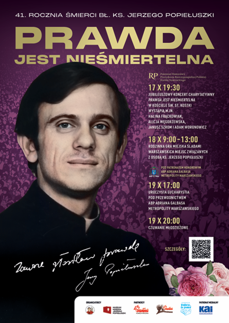 Wcześniej, 17 października o godz. 19.30 odbędzie się jubileuszowy koncert charytatywny pt. "Prawda jest nieśmiertelna". Wystąpią m.in. Halina Frąckowiak, Alicja Węgorzewska, Janusz Szrom i Adam Woronowicz. 18 października zaś w godzinach 9.00-13.00 będzie miała miejsce rodzinna gra miejska śladami warszawskich miejsc związanych z osobą ks. Jerzego Popiełuszki.