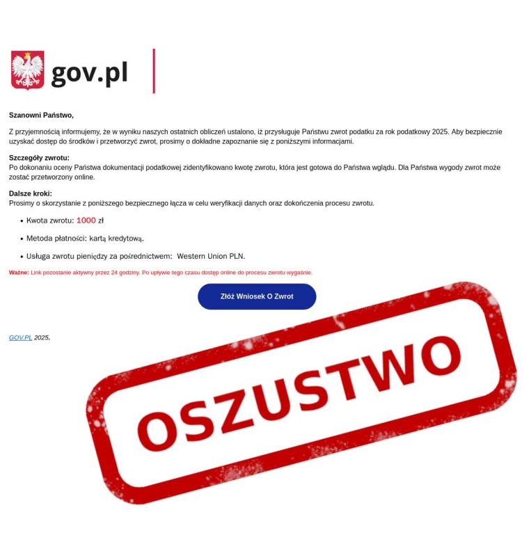 "Uprzejmie zawiadamiamy, że decyzją właściwego organu podatkowego, przysługuje Państwu zwrot nadpłaconej kwoty 853 złote. W celu usprawnienia procesu uruchomiliśmy nową platformę "zwrot2025", przez która prowadzimy teraz wszystkie wypłaty. Prosimy o kliknięcie w zamieszczony poniżej link, aby zostać przekierowanym i móc sfinalizować transakcje".