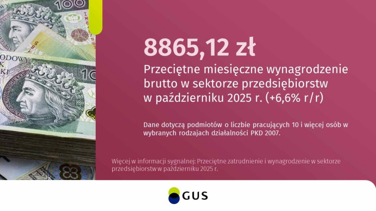 Główny Urząd Statystyczny (GUS) opublikował najnowsze dane dotyczące wynagrodzeń w sektorze przedsiębiorstw. W październiku 2025 r. przeciętne wynagrodzenie brutto wyniosło 8 865,12 zł.