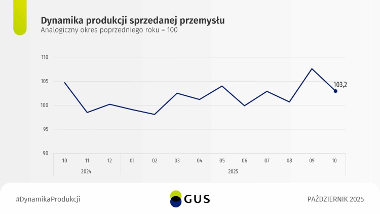 GUS przedstawił także dane dotyczące produkcji przemysłowej. W październiku 2025 r. produkcja przemysłowa wzrosła o 3,2 proc. w ujęciu rok do roku, a w porównaniu z wrześniem zanotowano wzrost o 5,4 proc.