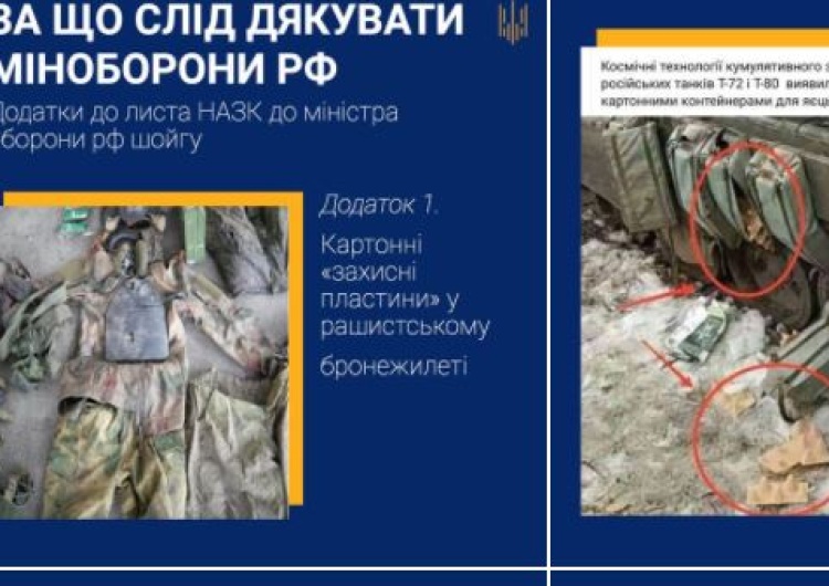 Ukraińcy wymieniają kompromitujące dla Rosjan przykłady. Na przykład osłony boczne rosyjskich czołgów T-72 i T-80 zostały wykonane z „kartonowych wytłoczek do jajek”, a kamizelki, które miały być kuloodporne, okazały się być wykonane zamiast z płyt pancernych to z… tektury.