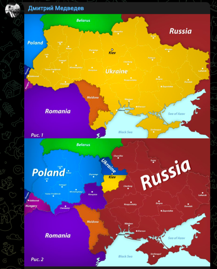 Jak wynika z „nowej mapy” Miedwiediewa, cała wschodnia i południowa Ukraina zostaje przyłączona do Rosji, część zachodnia podzielona między Rosję i Polskę. Do „rozbioru” Ukrainy miałyby dołączyć też Węgry (im przypada Użhorod) i Rumunia (obwody czerniowiecki i winnicki).