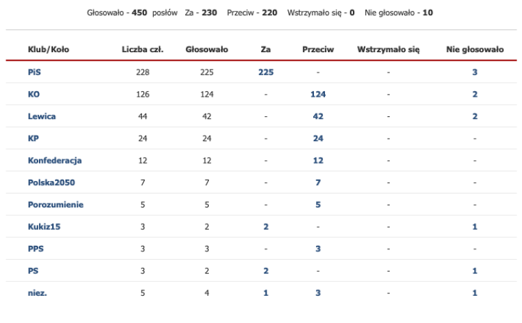 Za przyjęciem nowelizacji ustawy zagłosowało 230 posłów, przeciw 220 posłów. Nikt się nie wstrzymał, w głosowaniu nie wzięło udziału 10 posłów.